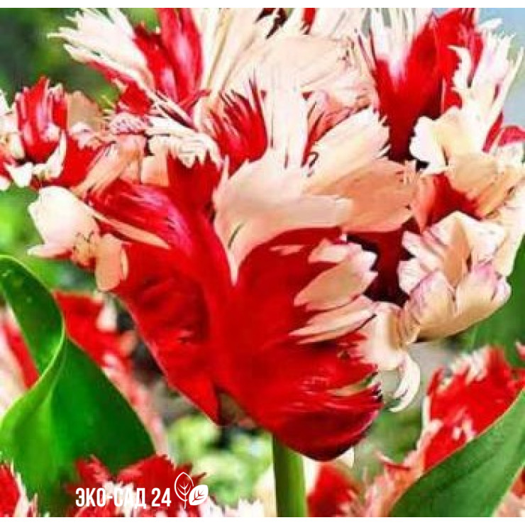 Тюльпан Попугайный Estella Rijnveld (Эстелла Рижнвельд) имеет яркую комбинацию цветов красного и белого, тюльпан определенно будет заметен в любом уголке сада. Белый цвет может иметь оттенки молочного и слоновой кости, отдельно заметим, что в расцветке могут появляться зеленые полосы. Сорт очень хорошо смотрится в букетах, успешно комбинируется с другими сортами, а также имеет одни из самых перестых листьев из серии попугайные.